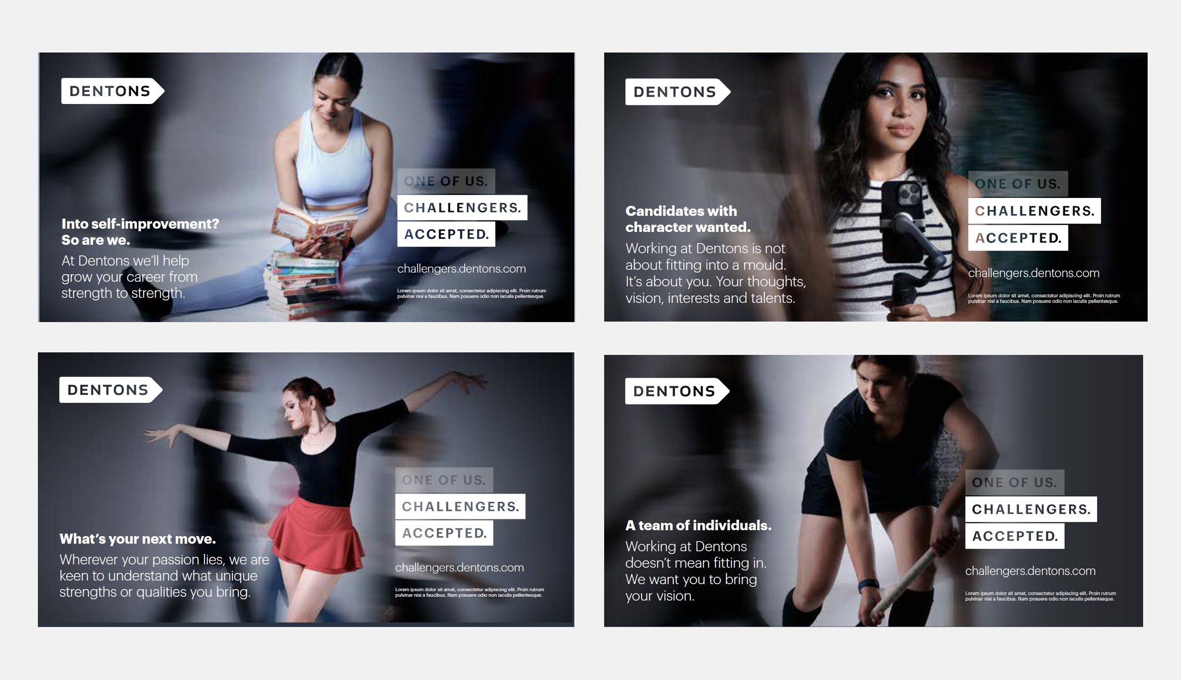 In a legal world often perceived as rigid and traditional, Dentons has set out to rewrite the narrative. The “Challengers Accepted” campaign is designed for young, bold graduates aspiring to embark on a thrilling career in law, and represents a paradigm shift in how the legal profession is perceived. We’ve leveraged adaptable graphics across print, display, web, and various other mediums to ignite the passions and aspirations of the next generation of legal professionals.
